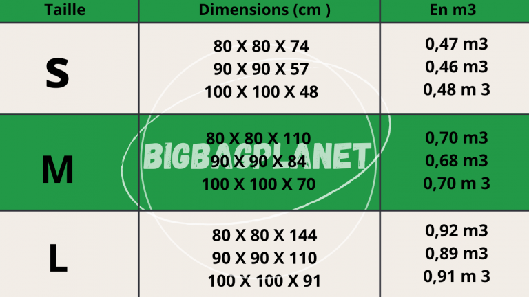 La fonction du big bag et de ce qu’il sera déposé à l’intérieur pourra définir le volume idéal. Par exemple, pour les agrégats, le big bag standard sera de 1m 3. Nous retrouverons les dimensions standard les plus vendu sur le marché 90 x 90 x 110 cm